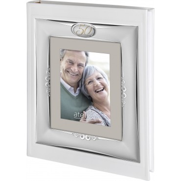 Atelier Argenti album con portafoto in copertina in lamina d'argento e pelle bianca moderno ed elegante in argento satinato e lavorazione ai lati in argento lucido, adatta a qualunque tipologia di arredo. In alto al centro è inciso "50°" in argento dorato, perfetta da regalare per i 50 anni di Matrimonio.