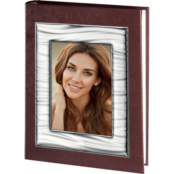 Atelier Argenti album di foto modello Georgette in pelle marrone con portafoto in argento martellato incorporata sulla copertina.