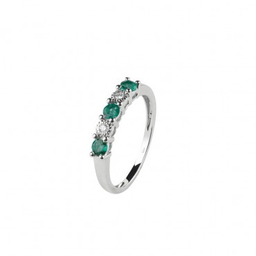 Bliss veretta in oro bianco rodiato 18 kt costituito da due diamanti da 0.03 kt totali e tre smeraldi da 0.45 kt totali. Disponibile nella misura 14 con possibilità di portarla a misura desiderata.