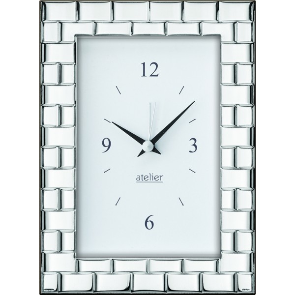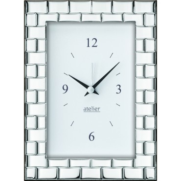 Atelier orologio sveglia da tavolo a mattoncini in lamina d'argento e retro in legno scuro elegante e raffinato adatta a qualunque tipologia di arredo, modello Straw. Sul retro si imposta sia l'orario che la sveglia. Sopra l'argento vi è una patina protettiva trasparente che lo preserva dallo scurimento nel tempo. Per questo non vanno in alcun modo spruzzati prodotti per l'argento o qualsiasi altro agente chimico, ma all'occorrenza, va utilizzato un panno morbido e asciutto per togliere la polvere. L'orologio resta invariato nel tempo, pulito e lucente come appena acquistato. E' un ottima idea regalo per qualunque occasione, arreda la casa o l'ufficio con eleganza e stile.