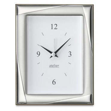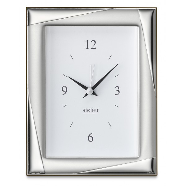 Atelier orologio sveglia da tavolo lucido e satinato in lamina d'argento e retro in legno scuro elegante e raffinato adatta a qualunque tipologia di arredo, modello Entrè. Sul retro si imposta sia l'orario che la sveglia. Sopra l'argento vi è una patina protettiva trasparente che lo preserva dallo scurimento nel tempo. Per questo non vanno in alcun modo spruzzati prodotti per l'argento o qualsiasi altro agente chimico, ma all'occorrenza, va utilizzato un panno morbido e asciutto per togliere la polvere. L'orologio resta invariato nel tempo, pulito e lucente come appena acquistato. E' un ottima idea regalo per qualunque occasione, arreda la casa o l'ufficio con eleganza e stile.