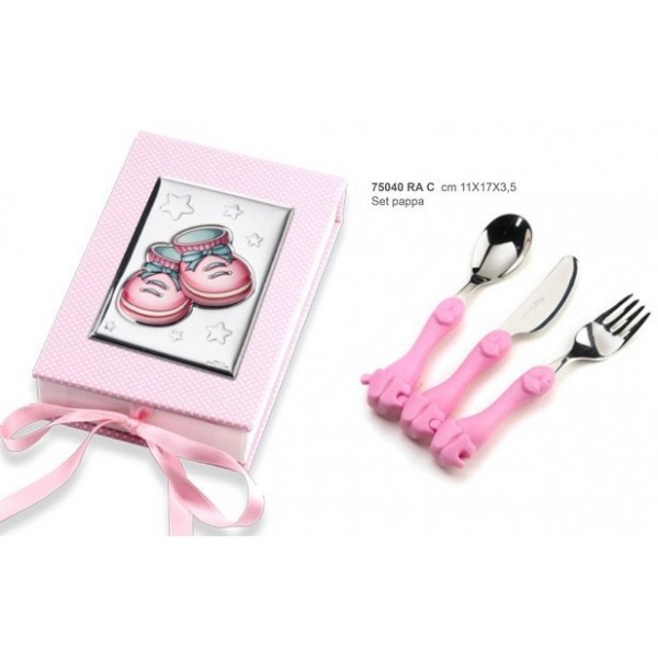 Set di posatine firmato Valenti & Co. da bambina tra cui forchetta, cucchiaio e coltello senza sega in acciaio col manico in plastica rosa contenute all'interno di un grazioso cofanetto in pelle rosa e lamina d'argento con scarpette e smalto rosa.