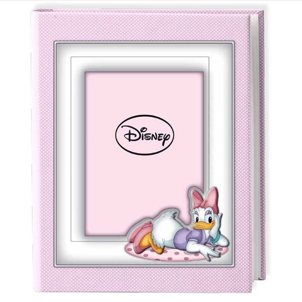 Disney album Paperina in argento e pelle rosa con cornice in copertina. E' originale e simpatico inserire la foto della bimba nel portafoto sulla copertina dell'album. All'interno le prime pagine sono a colori che raffigurano Paperina su cui è possibile scrivere i ricordi più belli.