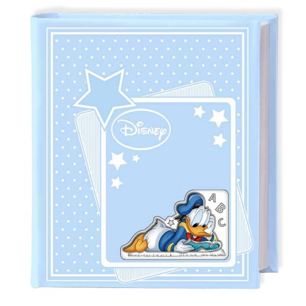 Disney album Paperino in argento e pelle celeste con Paperino in copertina con parti smaltate di colore celeste. All'interno le prime pagine sono a colori che raffigurano Paperino su cui è possibile scrivere i ricordi più belli.