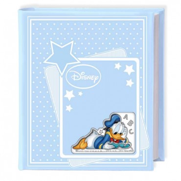Disney album Paperino in pelle celeste con Paperino in copertina con parti smaltate di colore celeste. All'interno le prime pagine sono a colori che raffigurano Paperino su cui è possibile scrivere i ricordi più belli.