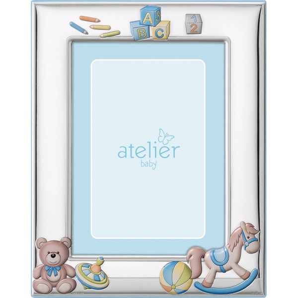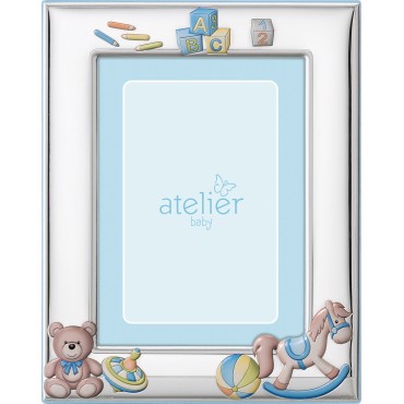 Cornice portafoto firmata Atelier Argenti da bambino in lamina d'argento e retro in legno celeste con cavallo a dondolo, orsetto e altre fantasie smaltati.