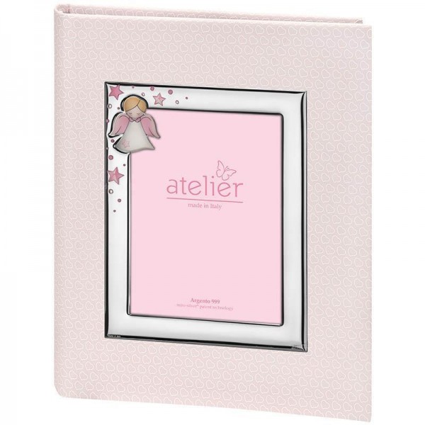 Atelier Argenti album con portafoto da bambina in lamina d'argento e pelle rosa, con angioletto.
