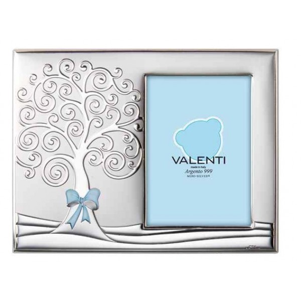 Valenti & Co. cornice portafoto da bambino e retro in legno bianco con albero della vita in argento smaltato celeste.
