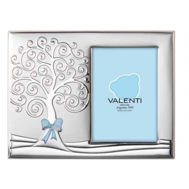 Valenti & Co. cornice portafoto da bambino e retro in legno bianco con albero della vita in argento smaltato celeste. Perfetta come idea regalo per la Nascita, il giorno del Battesimo oppure per il compleanno.