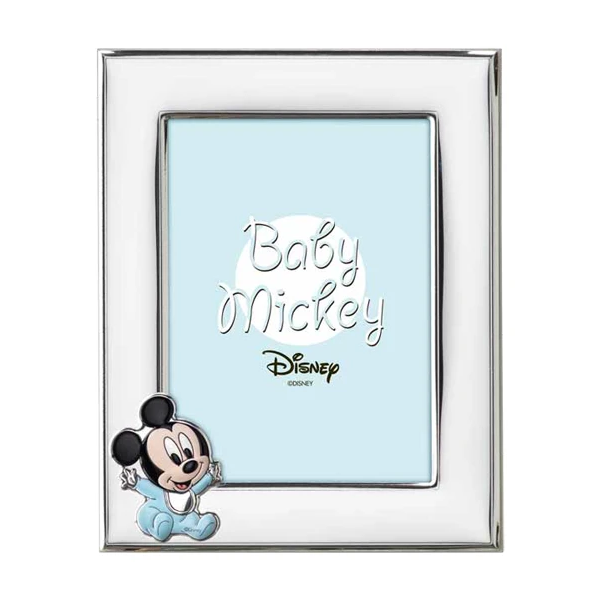 Disney cornice Topolino in argento e retro in legno bianco con Mickey mouse baby in argento smaltato di colore celeste.