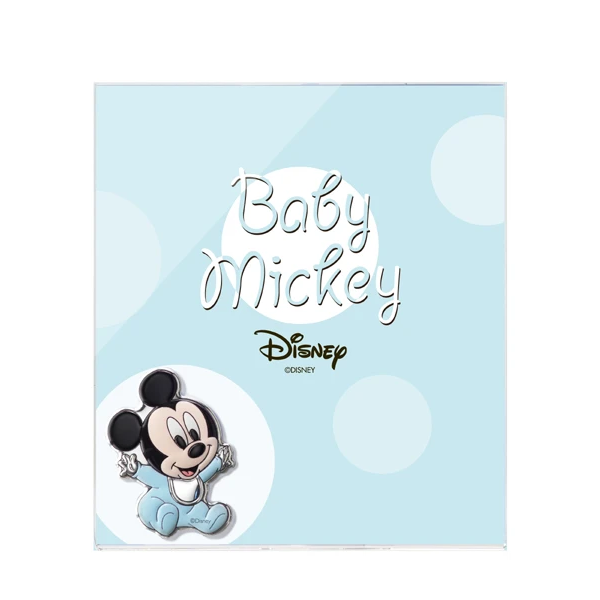 Disney cornice Topolino in argento e plex con Mickey mouse baby in argento smaltato di colore celeste.