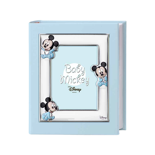 Disney album Topolino in pelle celeste con cornice in argento con Mickey mouse baby in copertina con parti in argento smaltato di colore celeste. E' originale e simpatico inserire la foto del bimbo nel portafoto sulla copertina dell'album. All'interno le prime pagine sono a colori che raffigurano Topolino su cui è possibile scrivere i ricordi più belli.