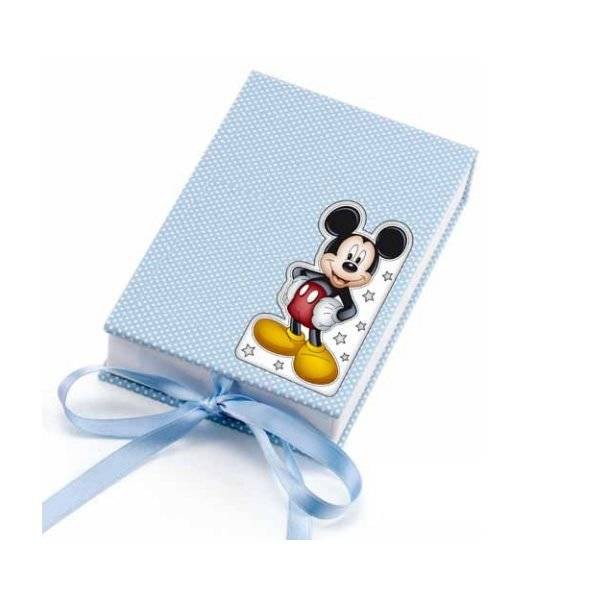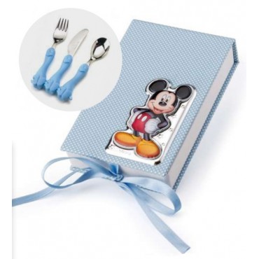 Disney set pappa Topolino in argento da bimbo con Mickey mouse in argento e smalto in rilievo. Il set all'interno della scatola, chiusa con un nastrino celeste incorporato, comprende le 3 posatine.