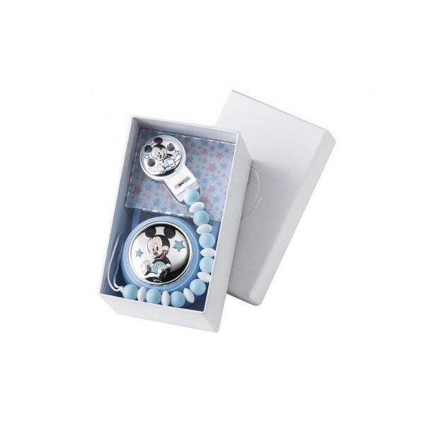 Disney portaciuccio Topolino in argento e plex da bimbo con la catenella a cui attaccare il ciuccio e all'altra estremità c'è la pinza da attaccare al body del bimbo con Mickey mouse in argento e smalto. All'interno della confezione c'è anche la scatolina in plex con Topolino in argento e smalto in cui riporre il ciuccio dopo l'uso per portarlo con sè sempre pulito ed appenderlo alla culla o passeggino per un pratico e veloce utilizzo. Perfetta idea regalo per nascita!