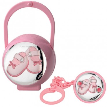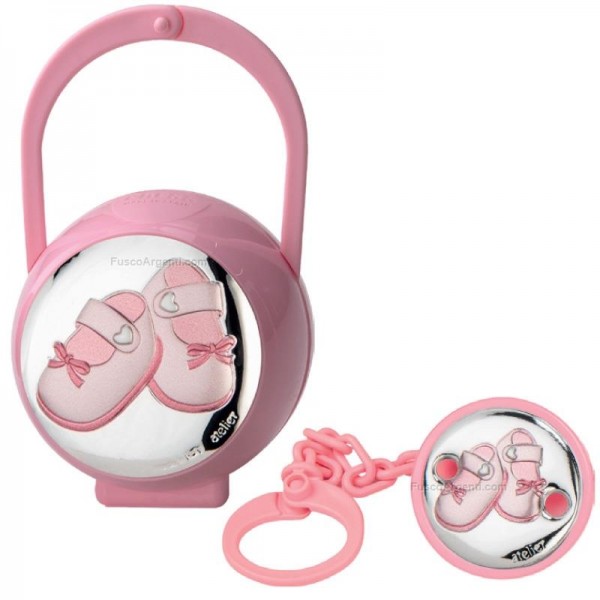 Atelier Argenti scatola portaciuccio con scarpette in argento e plex da bimba con la catenella a cui attaccare il ciuccio e all'altra estremità c'è la pinza da attaccare al body della neonata con scarpine in argento e smalto. All'interno della confezione c'è anche la scatolina in plex in cui riporre il ciuccio dopo l'uso per portarlo con sè sempre pulito ed appenderla alla culla o passeggino per un pratico e veloce utilizzo. Perfetta idea regalo per nascita!
