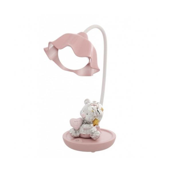Bagutta lampada led con orsetto in argento e plex da bimba, collo mobile con accensione touch sulla base con 3 intensità di luce. Si ricarica a corrente tramite filo in dotazione all'interno della confezione.
