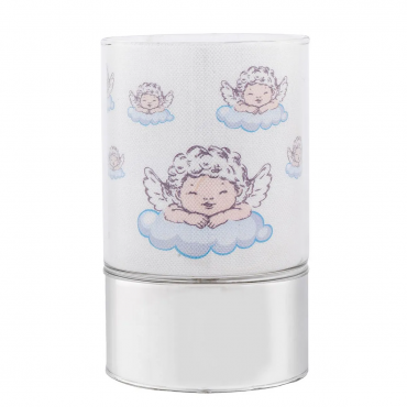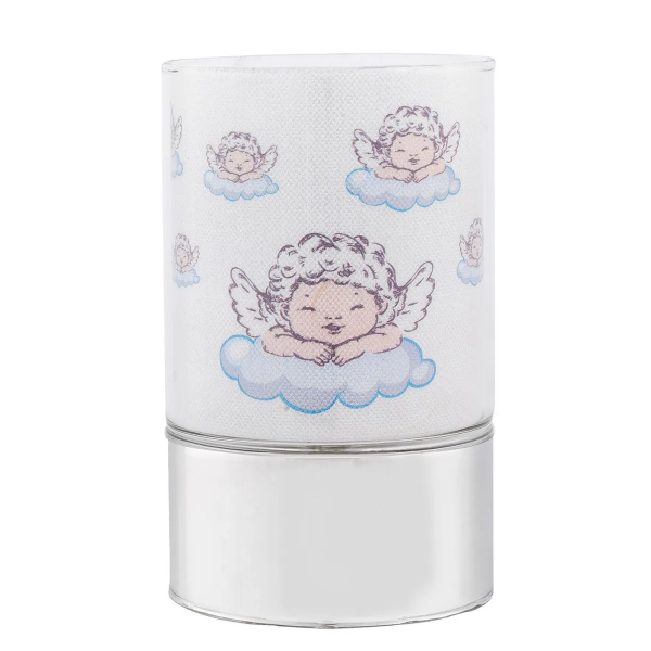 Bagutta lampada in vetro e base in argento da bimbo, con fantasia raffigurante angioletti, batterie all'interno. Questa lampada led è originale ed è un ottima idea regalo per la nascita, Battesimo e compleanno per abbellire e illuminare il comodino e la stanza del bimbo.
