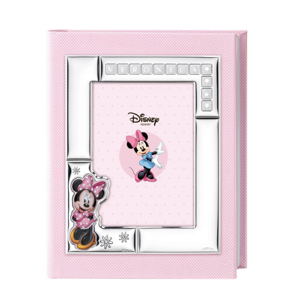 Disney album con portafoto Minnie in argento e pelle rosa in copertina con parti smaltate di colore rosa. All'interno le prime pagine sono a colori che raffigurano Minnie su cui è possibile scrivere i ricordi più belli. In alto a destra è possibile personalizzare la cornice incollando le lettere adesive, presenti nella confezione, e scrivere il nome della bimba.
