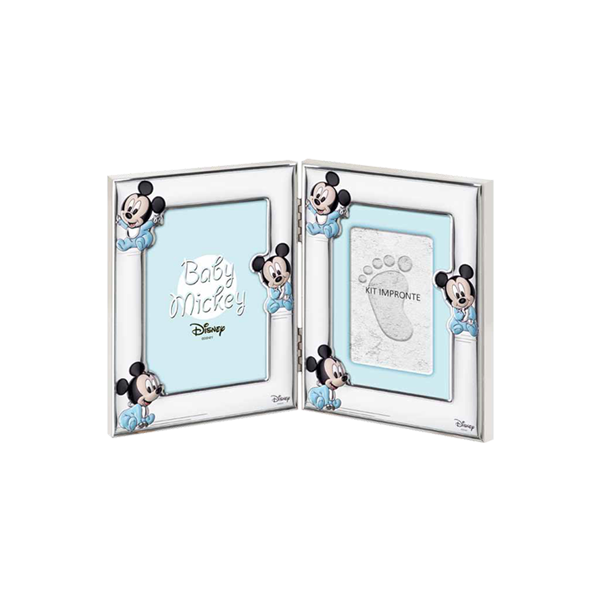 Disney cornice Mickey mouse da bambino in argento e retro in legno bianco con parti in argento smaltato di colore celeste con la possibilità di inserire l' impronta del tuo bambino come ricordo indelebile della sua crescita.