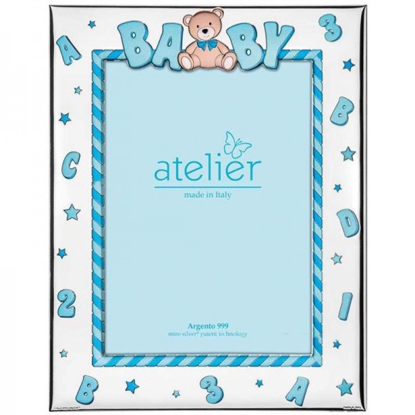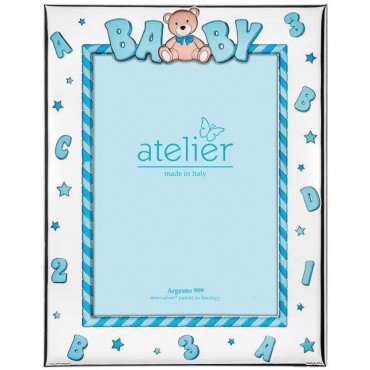 Cornice portafoto firmata Atelier Argenti da bambino in lamina d'argento e retro in legno celeste, con orsetto baby.