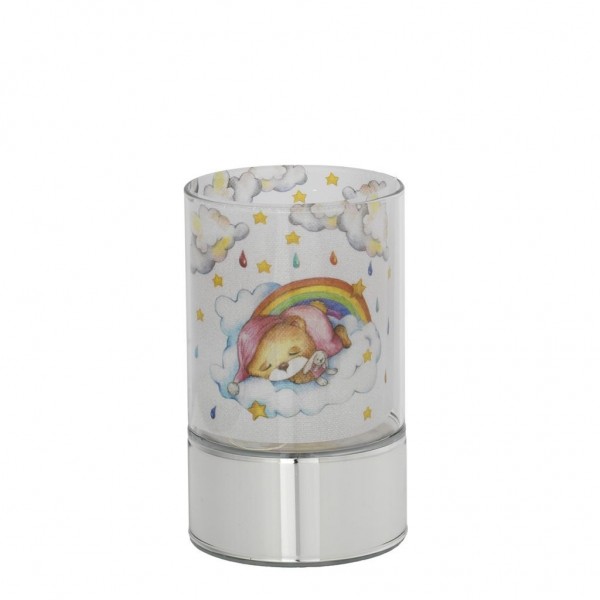Bagutta lampada in vetro e base in argento da bimbo o bimba, con fantasia raffigurante l'arcobaleno, batterie all'interno. Questa lampada led è originale ed è un ottima idea regalo per la nascita, Battesimo e compleanno per abbellire e illuminare il comodino e la stanza del bimbo.