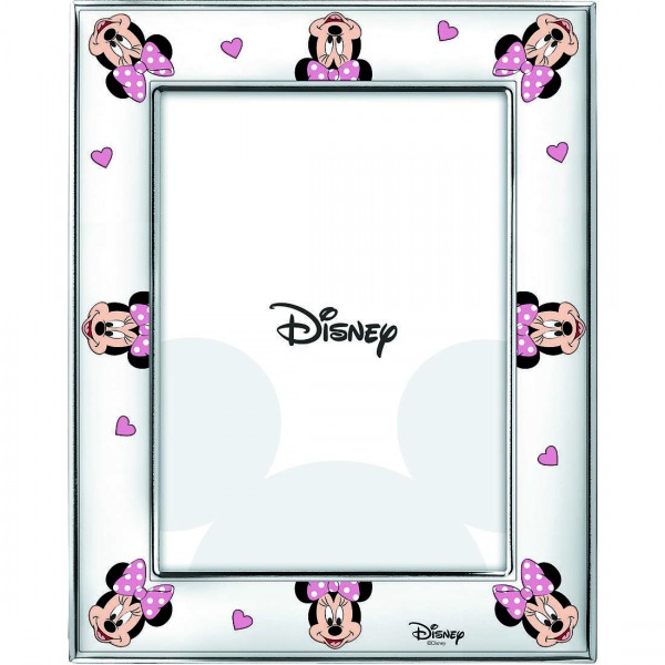 Disney cornice Minnie in argento e retro in legno bianco con Topolina con parti in argento smaltato di colore rosa.