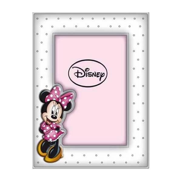 Disney cornice Minnie in argento e retro in legno bianco con Topolina, Minnie con parti in argento smaltato di colore rosa.