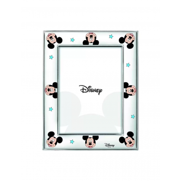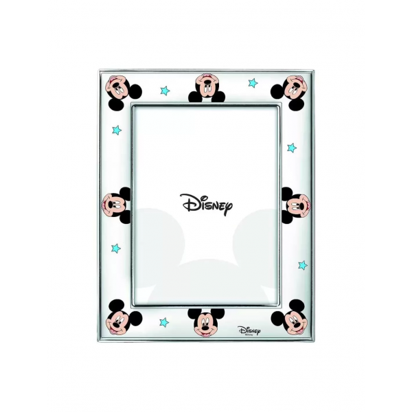 Disney cornice Topolino in argento e retro in legno bianco con Mickey mouse in argento smaltato di colore celeste.