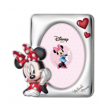 Disney cornice Minnie in argento e retro in legno bianco con Topolina, Minnie con parti in argento smaltato di colore rosa.