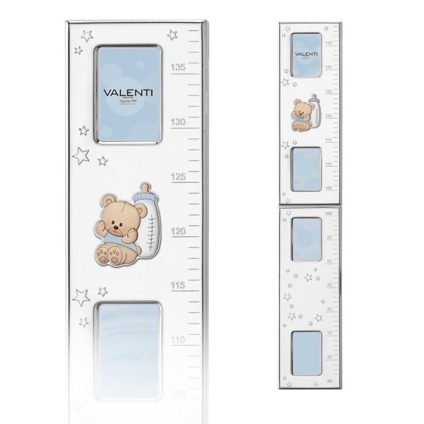 Valenti metro da parete da bambino in lamina d'argento e retro in legno, con orsetto e biberon. Il metro ha anche 4 portafoto incorporate per inserire le foto del bimbo. Il metro da parete è un'ottima e originale idea regalo per nascita, Battesimo o anche per il compleanno per arredare la cameretta e segnare la crescita del bimbo fino a 130 cm di altezza.