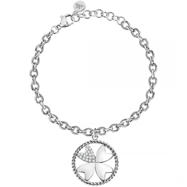 Morellato bracciale donna in acciaio con pendente a forma di quadrifoglio porta fortuna con una delle foglie ricoperta da cristalli. Chiusura regolabile con moschettone.
