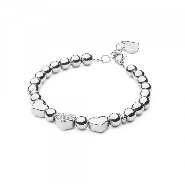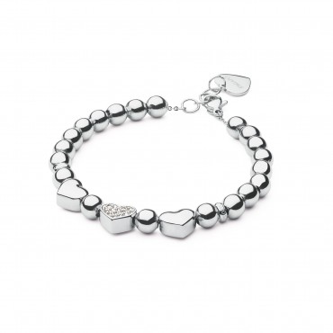 S'Agapo bracciale da donna della linea Bonjour in acciaio 316L inossidabile e anallergico con sfere e cuori con cristalli bianchi. Chiusura regolabile con moschettone.