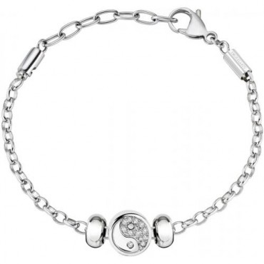 Questo bracciale firmato Morellato fa parte della collezione Drops con il charm ying e yang ricoperti di cristalli bianchi. Ai lati è affiancato da due anellini che lo tengono fermo al centro del polso. Chiusura con moschettone facilmente regolabile a seconda del polso.