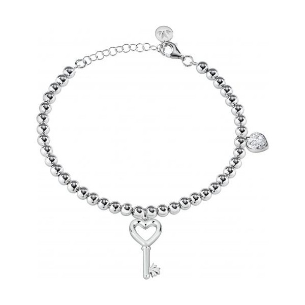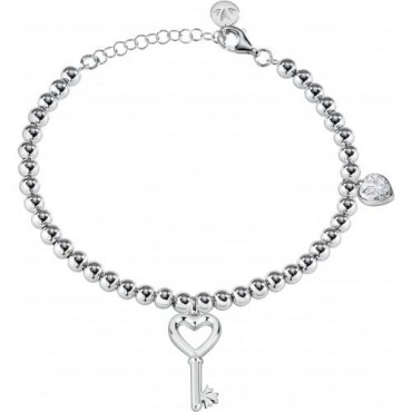 Bracciale da donna firmato Morellato della Collezione Istanti è composto da una maglia a pallini con un pendente centrale a forma di chiave e poco distante un altro ciondolo a forma di cuore come simboli portafortuna. La chiusura con moschettone permette di essere regolata a seconda del polso.