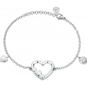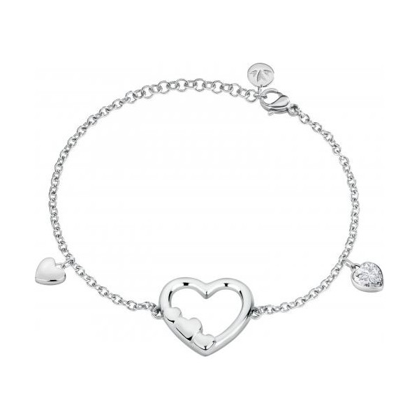 Morellato bracciale in acciaio della collezione Istanti è composto da una catenina decorata da tre cuori diversi fra loro, il centrale più grande, vuoto all'interno arricchito sulla superficie da tre piccoli cuori; equidistanti dal cuore centrale pendono dal bracciale due cuori più piccoli, uno in acciaio l'altro in cristallo. La chiusura è regolabile con moschettone.