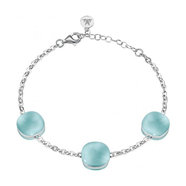 Questo bracciale firmato Morellato fa parte della collezione Gemma in argento 925% da donna, è a catenella caratterizzato da tre pietre Cat Eye di colore verde acqua tendente all'acquamarina di forma arrotondata, lungo 16 cm . Chiusura regolabile con moschettone.