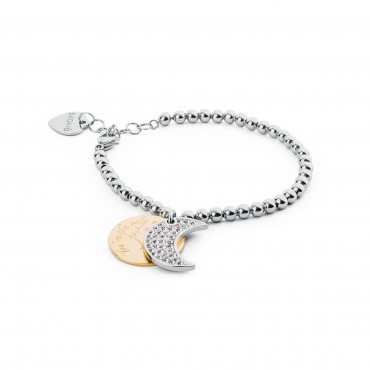 S'Agapo bracciale in acciaio a sfere con ciondolo a forma di luna ripiena di zirconi bianchi