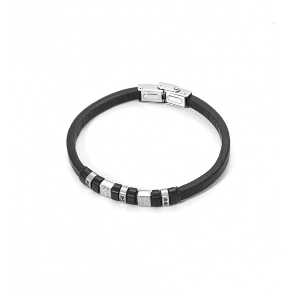 Questo bracciale da uomo della collezione Cesare Paciotti 4US è realizzato in pelle nero con parte centrale arricchita da elementi in acciaio lavorato su cui sono incastonati zirconi neri.