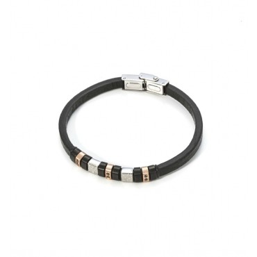 Questo bracciale da uomo della collezione Cesare Paciotti 4US è realizzato in pelle nero con parte centrale arricchita da elementi in acciaio ramato su cui sono incastonati zirconi neri.