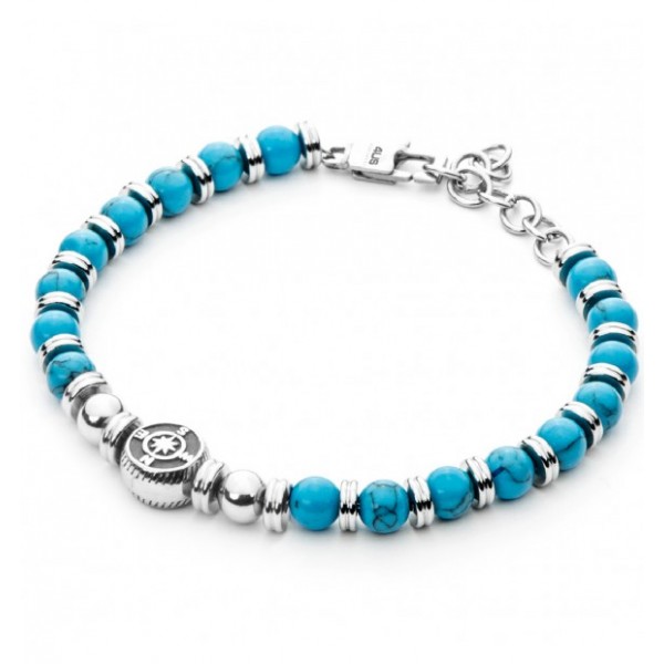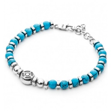 Questo bracciale da uomo della collezione Cesare Paciotti 4US è realizzato in acciaio inossidabile con sfere turchesi e al centro la rosa dei venti.