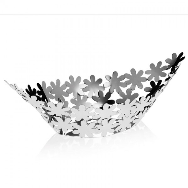 Centrotavola firmato Ottaviani modello "fiorito" in metallo argentato, può essere utilizzato anche come cestino per il pane. Dimensioni: 40 cm x 19 cm x h. 13 cm