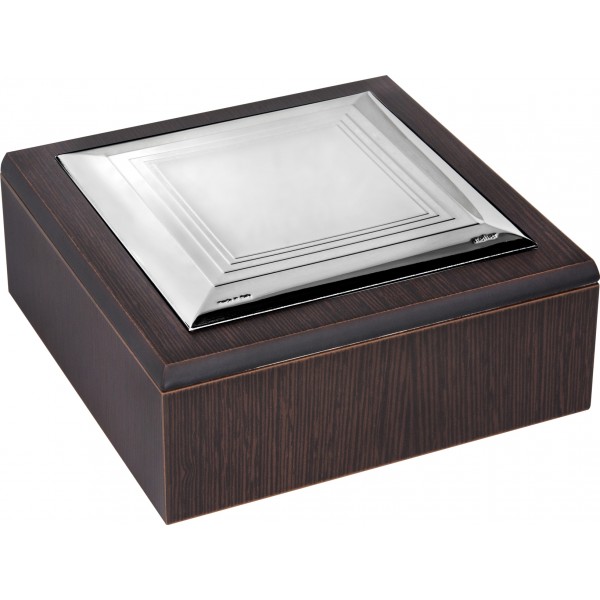 Atelier Argenti cofanetto modello Praga quadrato liscio con righe all'interno in lamina d'argento sopra e ai lati legno scuro.