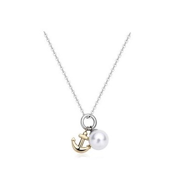 S''Agapo collana da donna della linea Days in acciaio 316L inossidabile e anallergico con pendente a forma di ancora in acciaio color oro e una perla bianca. Chiusura regolabile con moschettone.