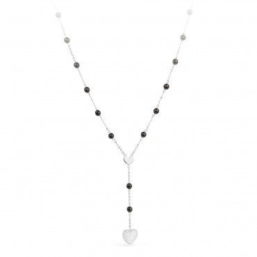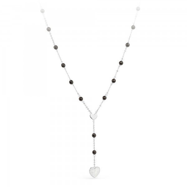 S'Agapo collana in acciaio con perle onice e pendente a forma di cuore pieno di cristalli bianchi