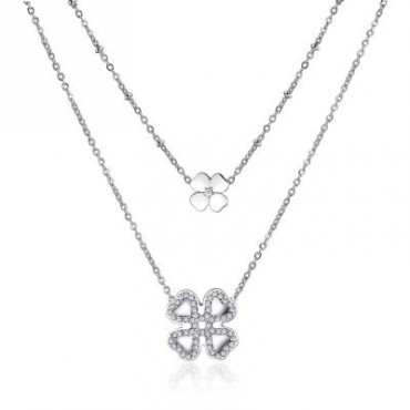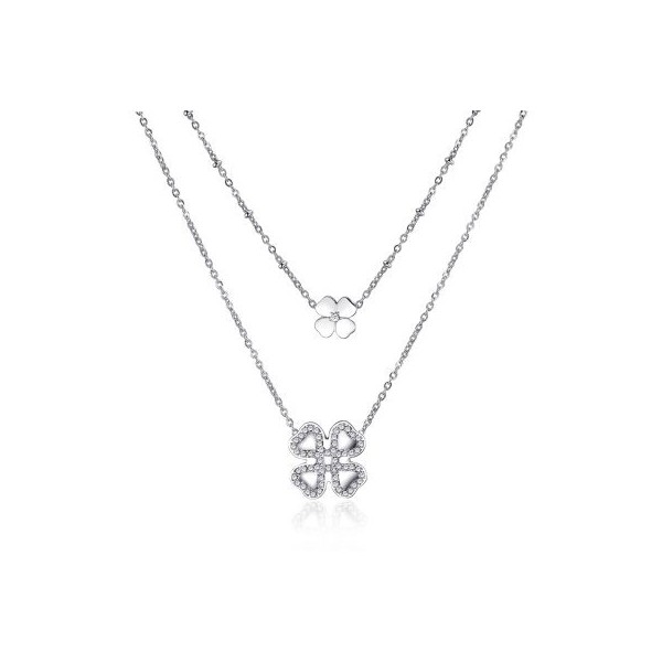 S'Agapo, marchio Brosway, collana da donna in acciaio a due fili uno più lungo dell'altro da cui pende un quadrifoglio, quello più piccolo in acciaio lucido, l'altro più grande con zirconi sul perimetro. La chiusura prevede il moschettone da agganciare a uno degli anellini a seconda del collo e della propria comodità. Eventualmente, sarà possibile aggiungere altri anellini così da poter allungare la collana.