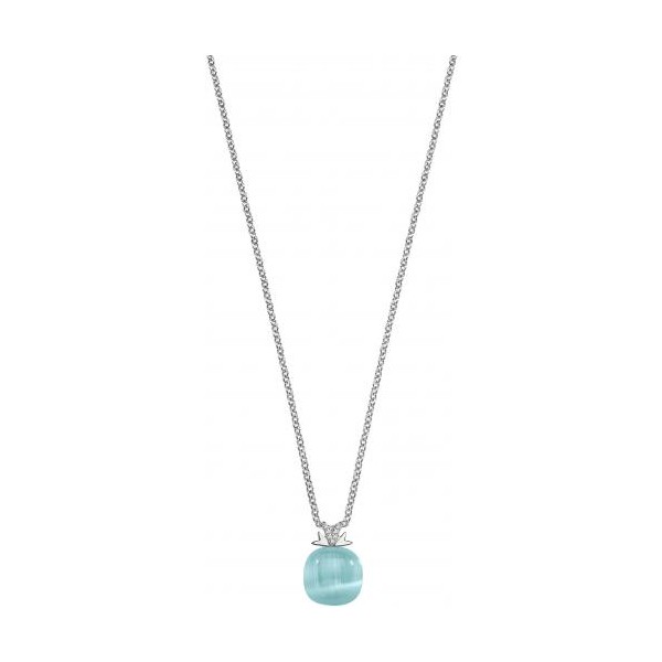 Morellato collana donna a girocollo in argento 925% della collezione Gemma ha un pendente con una pietra Cat Eye di colore verde chiaro di forma arrotondata su cui poggiano tre petali in argento a formare tre cuori di cui il centrale è ricco di zirconcini bianchi che donano maggior brillantezza e fascino al gioiello, nonchè simbolo del prestigioso marchio Morellato.