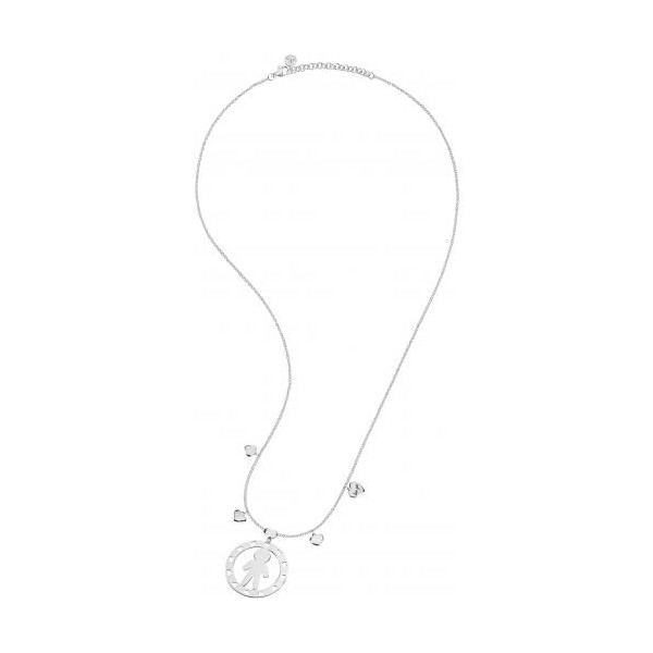 Morellato collana in acciaio della collezione Talismani con pendente un bebè maschio inscritto in un cerchio e sulla circonferenza ha una fila di cuori traforati. Lungo la collana pendono quattro cuoricini pieni in acciaio e uno ha la dedica " Love you" (Ti Amo).