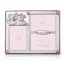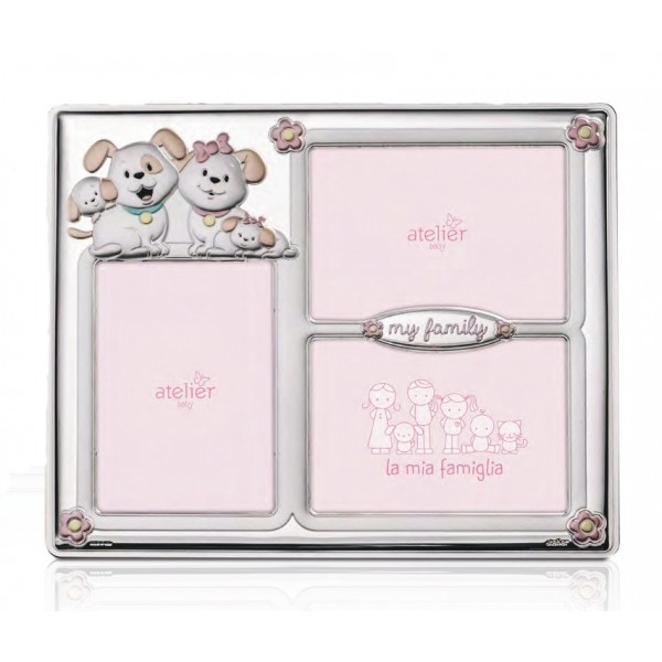 Atelier cornice portafoto da bambina multipla dedicata alla famiglia composta da 3 portafoto, una verticale e due orizzontali con spazio interno per la foto 9 x 13 cm rispettivamente, retro in legno rosa. E' arricchita da una famiglia di cagnolini con fiorellini sparsi e la scritta "my family" in argento smaltato rosa.