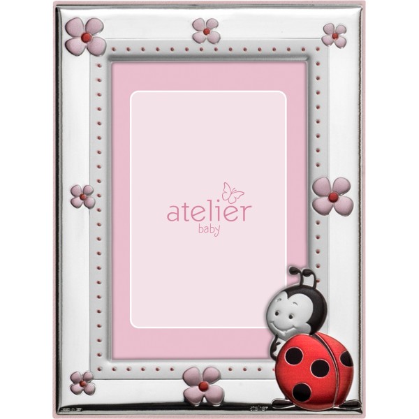 Atelier Argenti cornice portafoto da bambina in argento e retro in legno rosa con coccinella portafortuna.