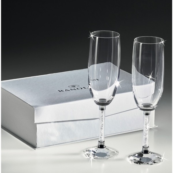 Ranoldi coppia di Flute, calici da brindisi, in cristallo ed elementi in metallo argentato con all'interno del gambo una pioggia di strass. Ottima idea regalo per Matrimonio, inaugurazione di casa, oppure per compleanno.